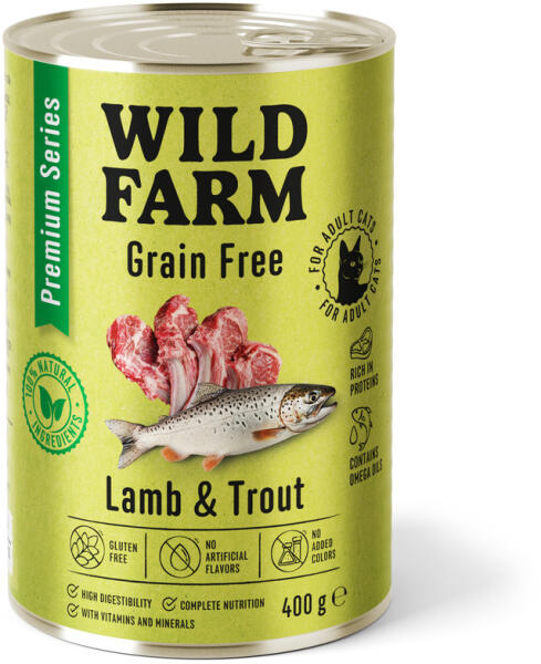 Hrană fără cereale Wild Farm Lamb & Trout 400g. Mielul și păstrăvul, uleiul de somon, taurina și mineralele susțin sănătatea pisicilor adulte.
